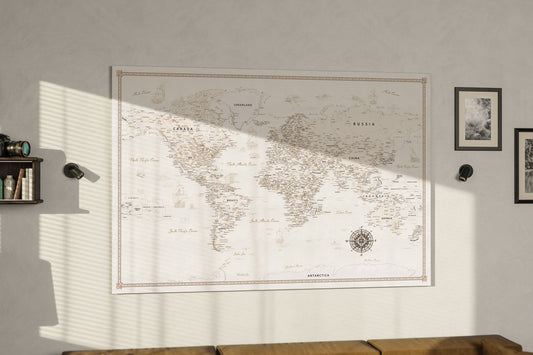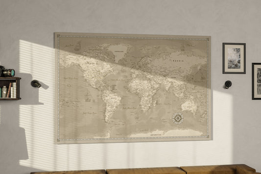 Carte du Monde Personnalisée sur Toile avec Épingles - Crème